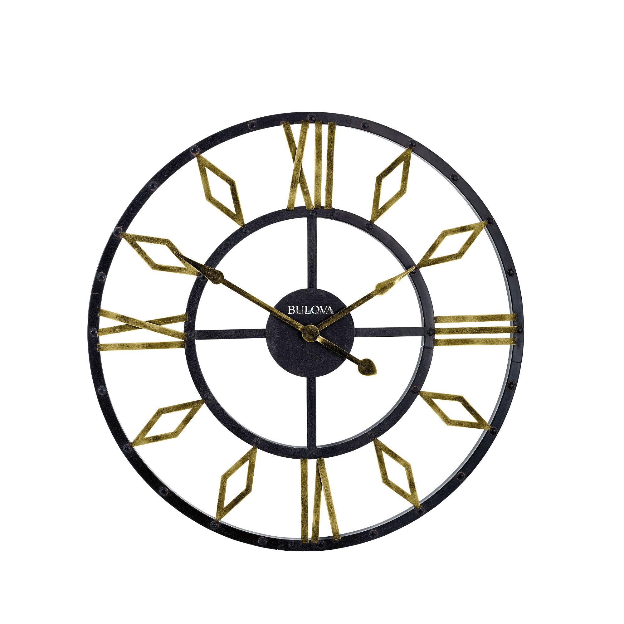 This 36 inch Diameter clock has a black metal case accented by aged gold Roman Numerals and hour markers, The clock assembles easily allowing the shipping carton to be small and easy for UPS or FedEx shipping. The center time keeping disk easily removes once the clock is hung on the wall for battery replacement of time setting, no need to remove the complete case. The hi tourque accurate quartz movement uses 1 C battery not included.