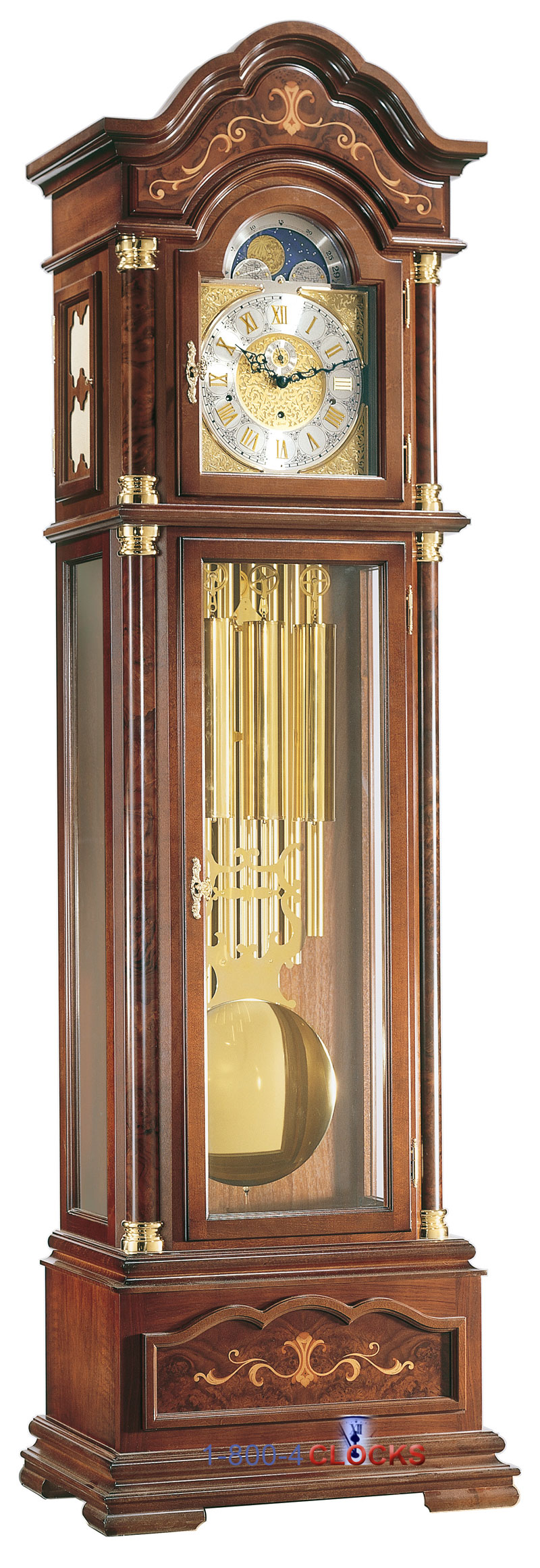 The 8-day cable driven triple chime movement (Westminster, Whittington, St. Michael), features 9 (nine) tubular chimes brass tubes, automatic night shut-off and moon phase.