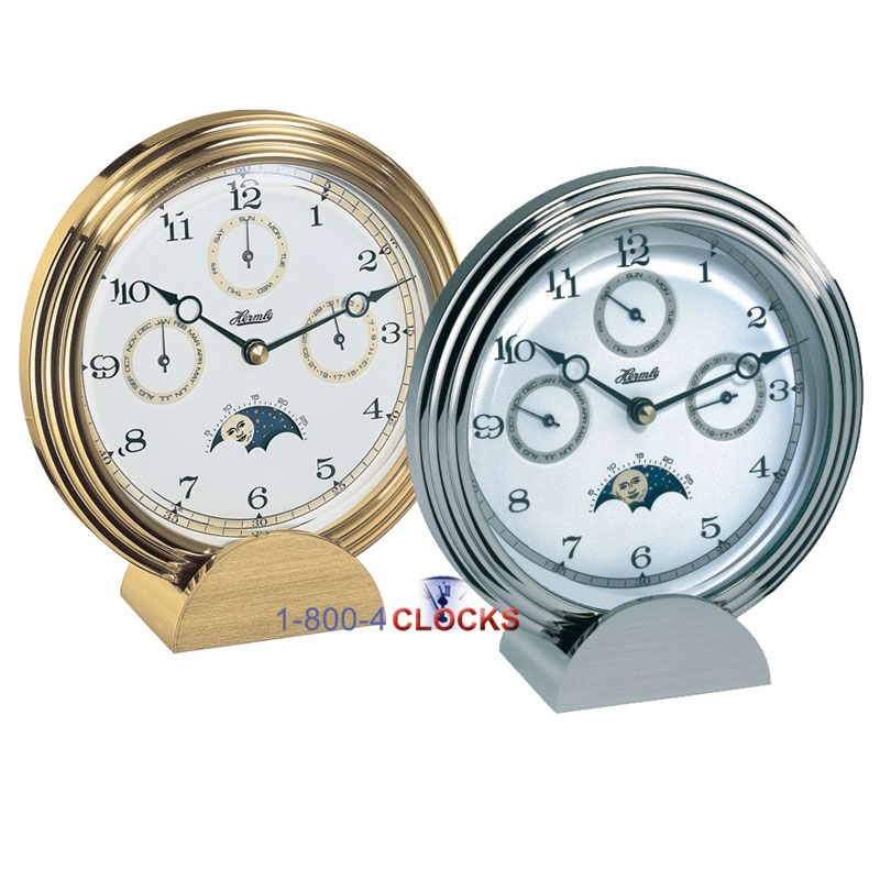 Hermle Stockton I Solid chrome-plated brass table or mantel clock with multifunctional dial with German-made quartz time movement. Made in Germany.
