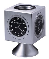 This unique brushed aluminum cube spins on a swivel base, and features a clock, thermometer, and hygrometer, with a compass on the top.