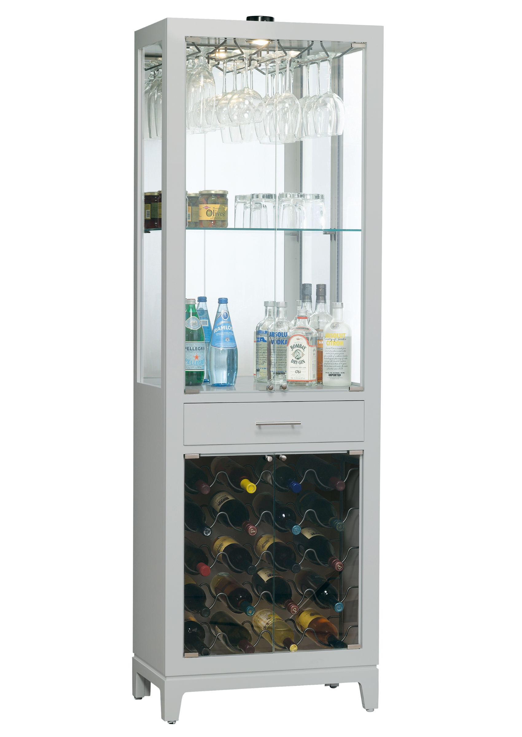 • The top display area has a hanging stemware rack, a mirrored back, and one adjustable glass shelf.