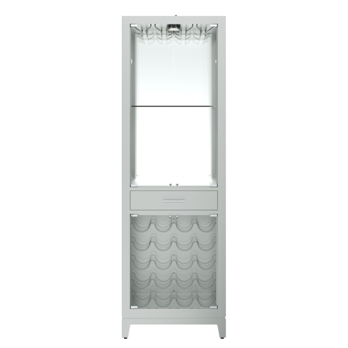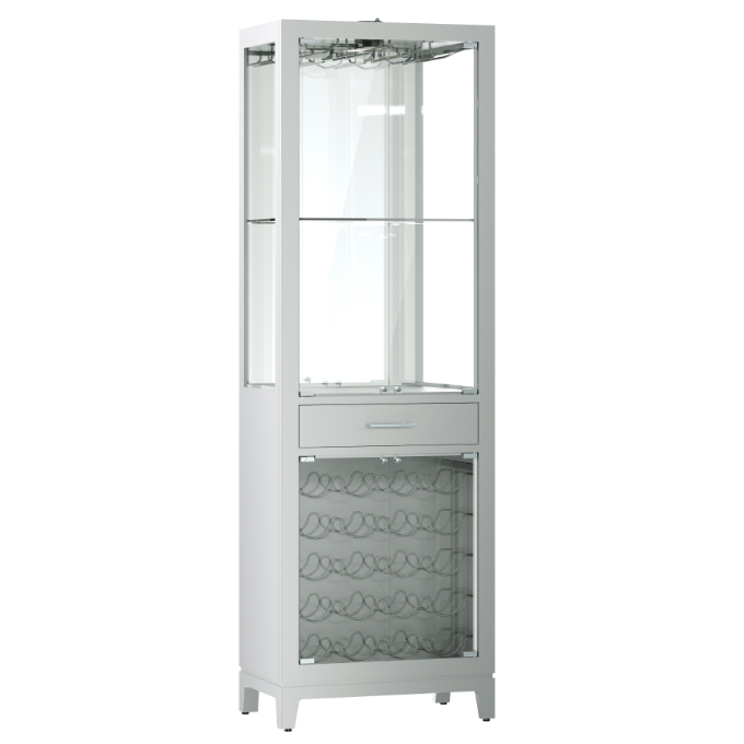 • Four glass doors: two for the top display area and two for the bottom wine storage area.