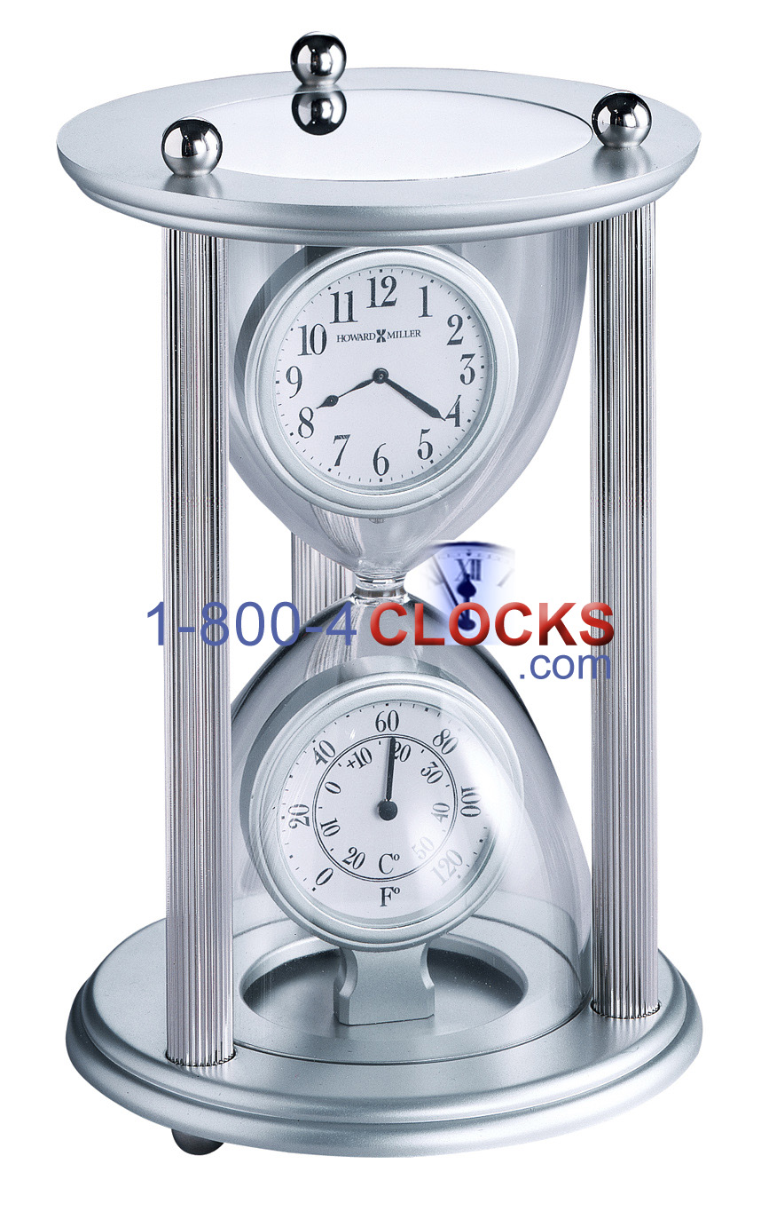 The shatterproof acrylic hour glass features polished silver fluted pillars and ball feet.