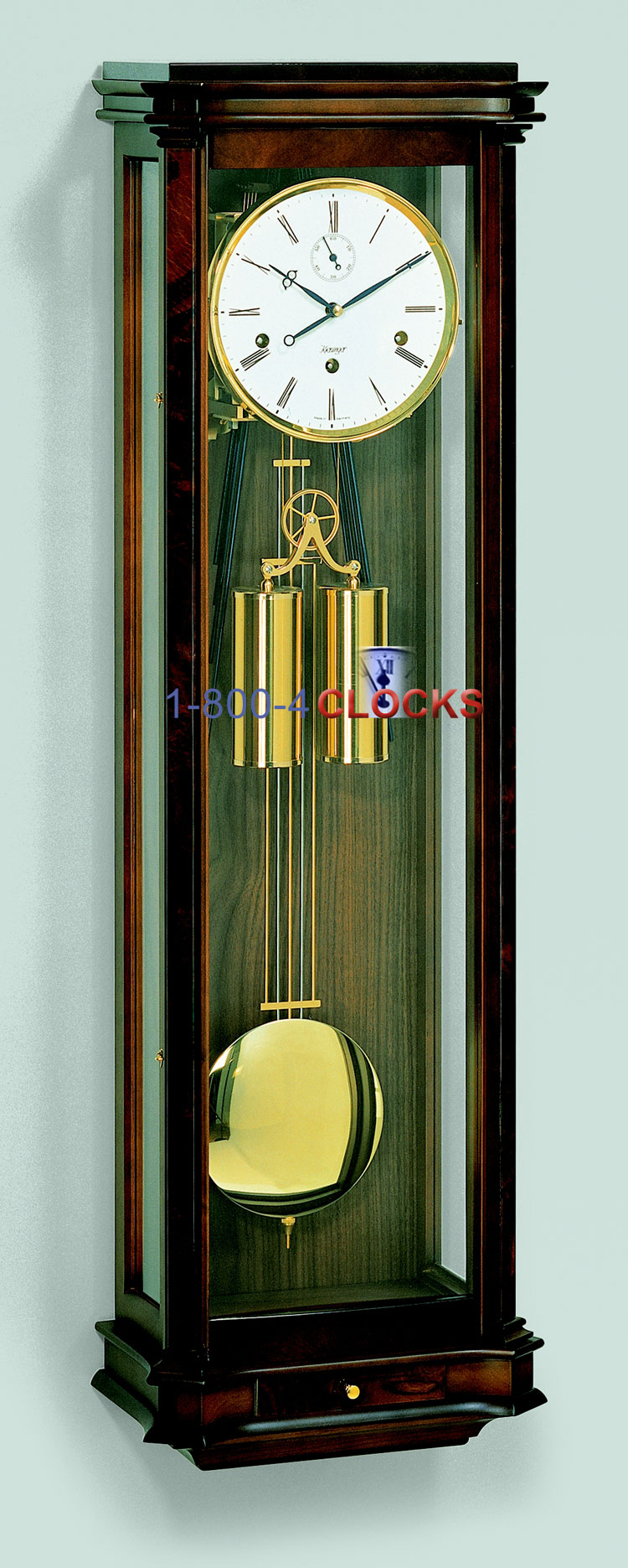 Fine cable regulator in walnut finish with polished burl applications and small drawer for the crank key in the base, featuring genuine enamel dial 18 cm with second indication, milled Vienna-style hands and polished grid pendulum. Movement: RWS13 4/4 cable/key wind movement with Westminster chime on 8-rod gong, automatic beat adjustment seconds indication & automatic night time shut-off between 10.00 PM and 7.15 AM.