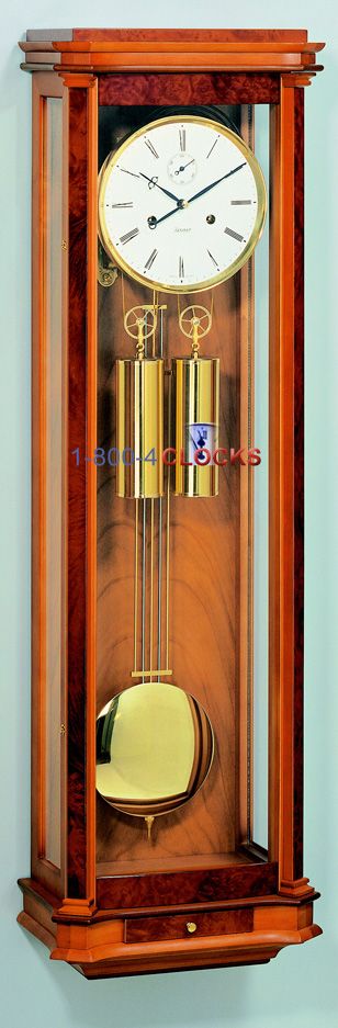 Fine cable regulator in cherry finish with polished burl applications and small drawer for the crank key in the base, featuring genuine enamel dial 18 cm with second indication, milled Vienna-style hands and polished grid pendulum. Movement: RWS 4/4 cable/key wind movement with Westminster chime on 8-rod gong, automatic beat adjustment seconds indication & automatic night time shut-off between 10.00 PM and 7.15 AM.