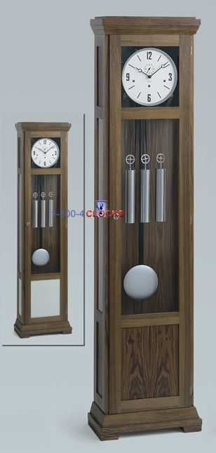 Floor clock featuring style and finish of the current furniture design trend. Waxed dark walnut with reversable base panels (dark walnut / cream) and satin nickel finish accessories. 1/4 cable movement, Westminster chime on 8-rod gong, automatic beat adjustment, maintaining power, true second and automatic night time shut-off between 10.00 PM and 7.15 AM.