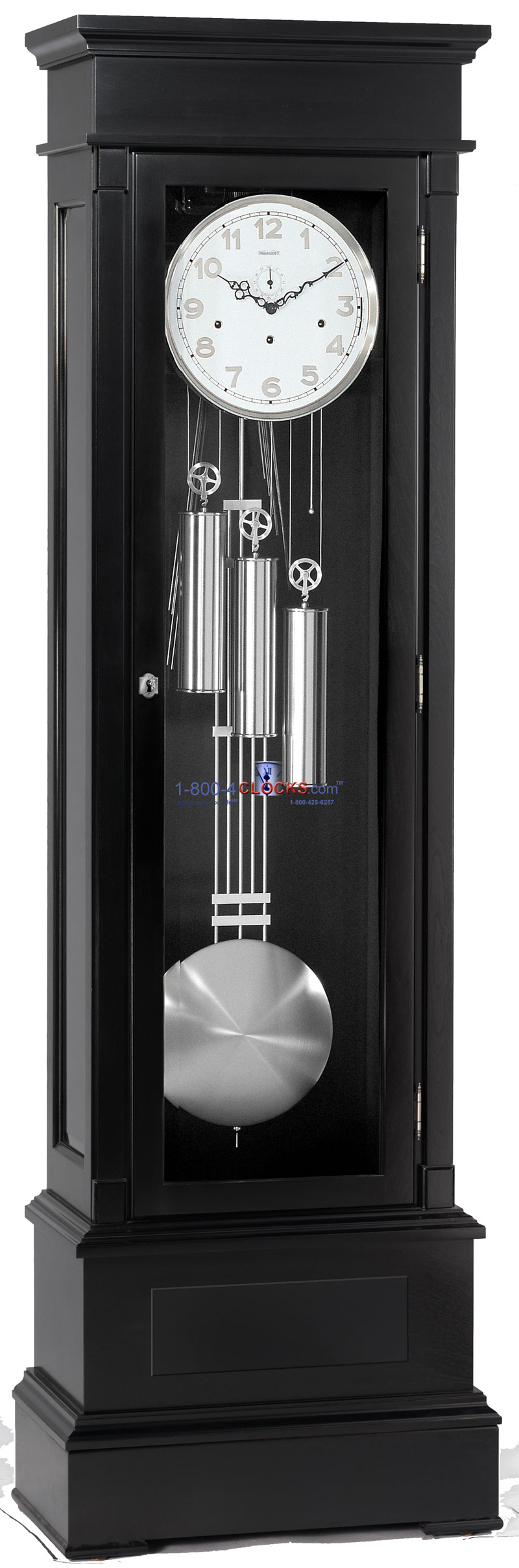 Hardwood cabinet with tempered beveled glass in front door and tempered gray smoked-glass side panels. Cable-wound triple-chime movement. Off-white dial with raised satin silver-finish Arabic numerals. Satin Black.