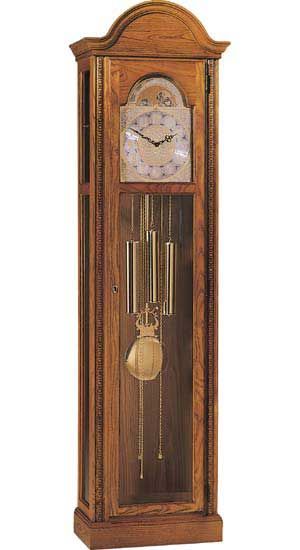 A simple bonnet pediment and delicately embossed columns grace this clock, which is finished in Golden Oak on select hardwoods and veneers. An embossed brass finished dial with a stationary moon features raised center design, corners and Arabic numerals.
